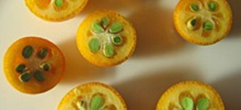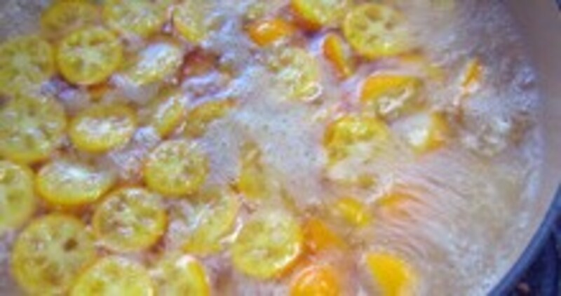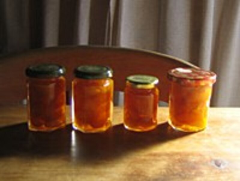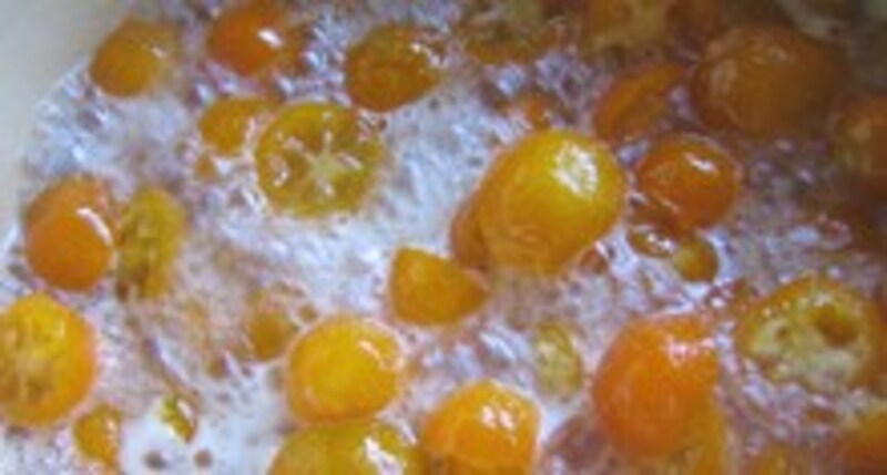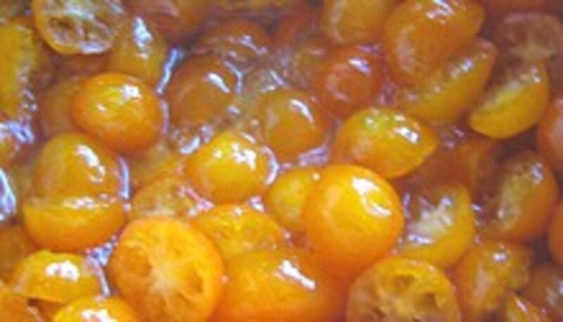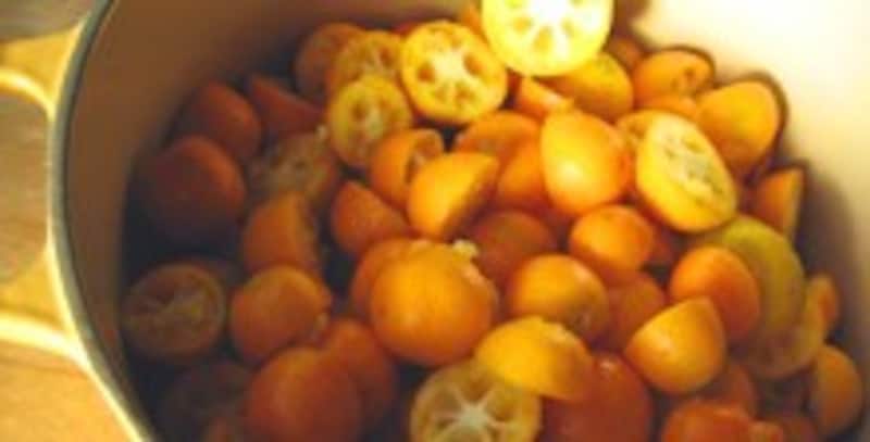 【材料】 金柑 500グラム グラニュー糖 250グラム 【作り方】 1. 金柑を洗って横半分に切る。 2. 種を楊枝で取り除く。 3. ほうろうの鍋に入れて水を注ぎ、強火で沸騰させて茹でこぼす。 4. グラニュー糖を入れて弱火でコトコト煮る。 白ワインを入れるときはここで。 5. 泡をすくいとりながら、やわらかくなるまで煮る。 6. やわらかくつやつやとしてきたら、できあがり。 7. 煮沸消毒した瓶につめて、密封します。 ちょっと素敵なプレゼントにもなります。 |