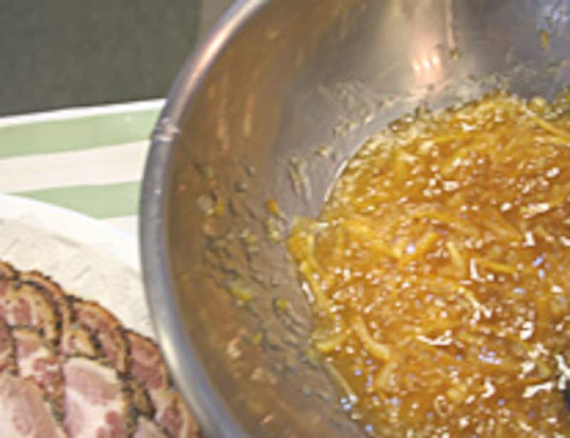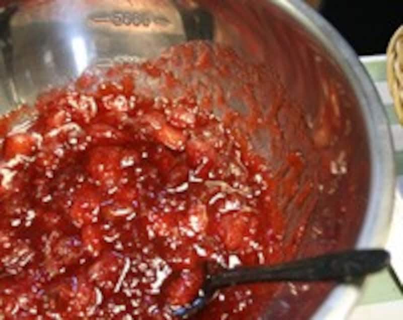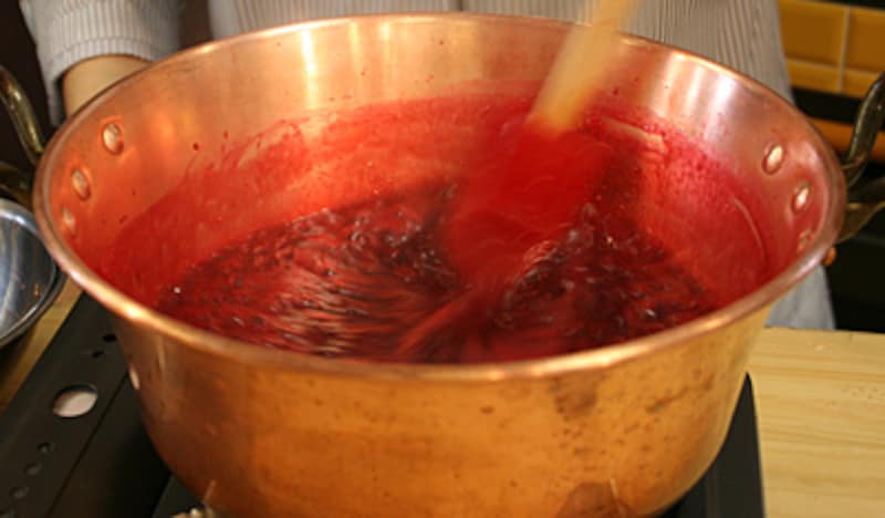 アベイユ ノンケミカルなレモンと蜂蜜のマーマレード。 果肉の薄皮はジャムを固める助けになるのでつけたまま。仕上がりはサラサラでも冷えるとゼリーのように「また一緒になりたい! と固まる」と、ろみさん。 レモンの皮はさわやかな香りがブルーベリージャムにも合います。お菓子で定番になっている組合せをあえてジャムですると、新鮮でありながら味の想像がつくので「食べてみたい」と思わせるものができるのです。 ミミ 数年前から人気の素材、リュバーブといちごのジャム。 煮あがりの目安は「いちごがふくらんで、しぼんだらいい頃」。リュバーブはとろみがつくのでジャム向きの素材です。アクは丁寧にすくいます。名前のとおり色合いがかわいい、甘酸っぱいジャムです。 スーリール 定番人気商品のフランボワーズとキルシュのジャム。 ほほえんでしまうようなロマンチックな味だからこの名前がつきました。 ろみさんのジャムはほとんどが材料の砂糖の量を果物対比80%で作られます。理由はフルーツの香りを損なわないように強火短時間で一気に仕上げるから。なるほど、3種のジャムはどれも沸騰して3~6分で出来上がりでした。 「フルーツの季節、品種、産地による味や香りの違いが興味深い」というろみさんがジャム専門店を始めたきっかけのひとつは、自家製と市販品の味の違いに疑問をもったこと。自分がお客さんとしていきたいお店を想像したそうです。余計なものを使わず、フルーツの持つ力(とろみがつくなど)を生かしたジャムは、だから人気なのですね。 さて、上記右下の写真はアルザスの白ワイン、ピノブランです。春に瓶詰めされたものでジャムのある食卓にもぴったりでした。 実演の後は、アルザスやバスクなどフランスの地方のお店や食べもののスライドを観て、それからろみさんの仕事のお話をうかがいました。 次のページは夢を実現する夢想家、ろみさんの仕事のお話 「いがらしろみさんがジャム専門店を開くまで」 です。 【関連記事】 クラブ ド サントノーレ 【第一回】志賀勝栄氏に学ぶ |