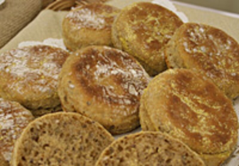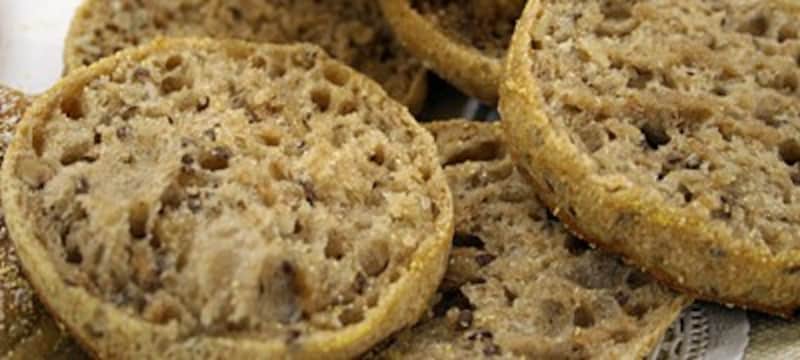 講師を務めたロバート・ジョリン氏はスイスで60年以上続くベーカリーの家に生まれ、ヨーロッパでペストリーシェフとしての経験を積んだ後、渡米し、1999年にクープ・デュ・モンド(ベーカリーワールドカップ)で優勝したアメリカチームのひとりとなりました。現在はアメリカ料理学院(CIA)の講師をされています。 セミナーで実演があったパンから、最初に食事に向くものを、次に朝食、スナック、デザートと幅広く味わえるパン屋さんのスウィーツをご紹介します。 詳しいルセット(業務用)をご希望の方はこの記事の最後をご覧ください。 食事向きのパン■ウォルナッツのマルチグレイン イングリッシュマフィンイングリッシュマフィンは今、アメリカで朝食のアイテムとしてベーグルを抜く人気になってきているそうです。 さまざまな種類がありますが、ここで紹介されたマフィンには胚芽、亜麻仁、ライフレーク、ひまわりの実、クルミなどの穀物類を入れ、表面にはコーングリッツをつけます。水分が多い生地は大きな気泡のあいたおいしいパンになりますが、やわらかすぎて扱いにくいので、型(8センチ)で抜いたらシートに置き、一回り大きいセルクル(9センチ)をかぶせるように置いて焼くといいそうです。