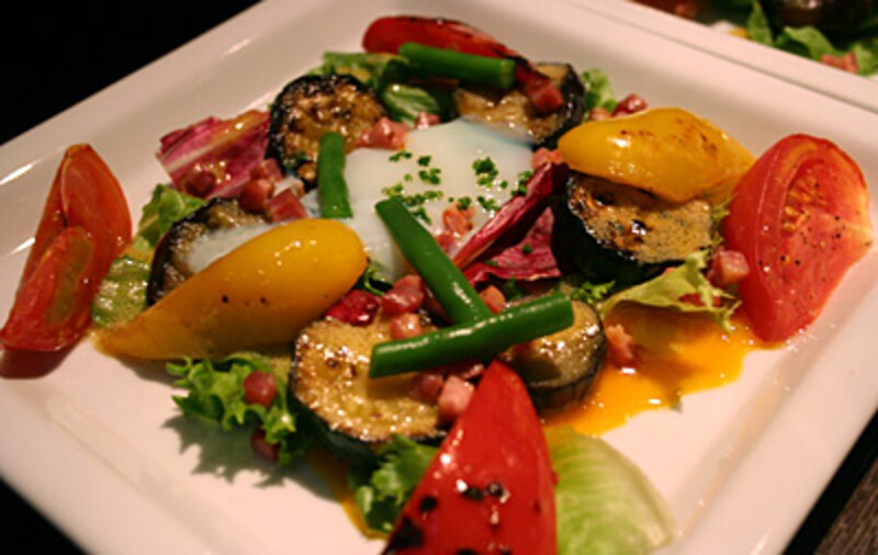 茄子、パプリカ、ズッキーニなどの焼き野菜に温泉卵をのせたサラダは、チーズと合うだけでなく、とろとろの卵をパンに絡めたりもできる、うれしい一皿でした。