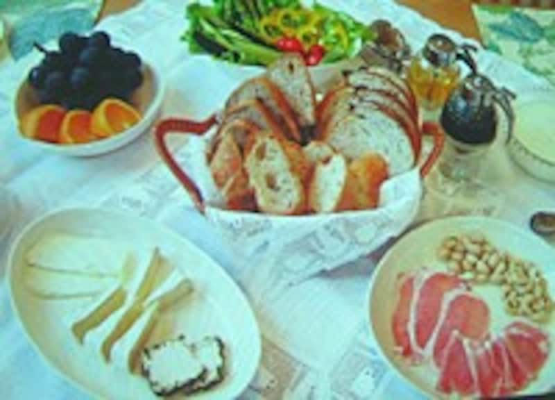 白仁田さんからは、週末に奥様を休ませるブランチの提案もありました。食材を切って並べるだけ、男性でも簡単にできるこのスタイルは養蜂家の食卓を参考にしたものだそうです。 ブランチのパンは、バゲット、カンパーニュ、イチジクとクルミのパンなど3種類ほど用意します。あとはハムやチーズ、野菜や果物、はちみつなどをテーブルに並べるだけ。自分で自由に選び、組みあわせて食べる楽しさが、手をかけていなくても豪華な感じ、ゆたかな時間をつくり出すのですね。