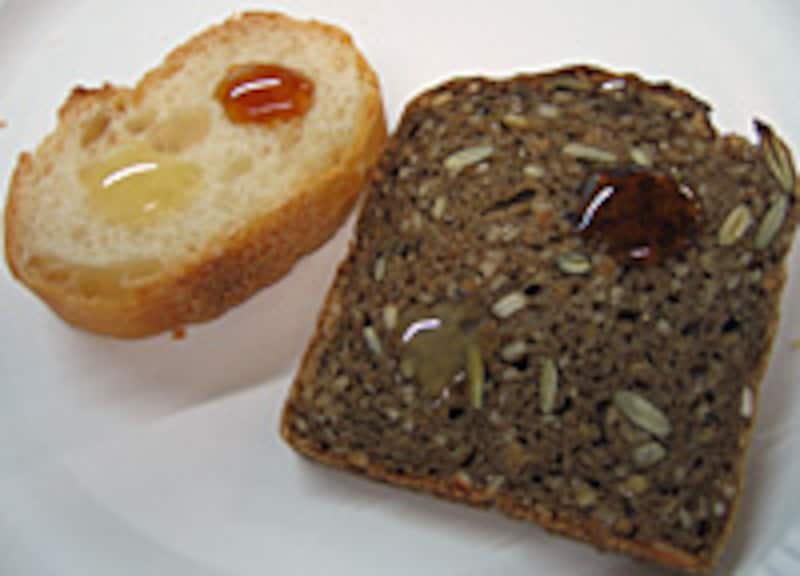 ベストパンを愉しむイベントを手伝ってくださったこともある、大山(だいせん)ハムの宗平唯さんの話はそんなふうに始まりました。 営業先のベーカリーにメニュー提案している中から、手間ひまかかった食材、意味のある組み合わせのおいしさを、 カスクルート(フランスパンのサンドイッチ)や右の写真のようなタルティーヌなど具体的なかたちにしていくつか見せてくれました。 オリーヴオイル、塩胡椒を加えるという、ちょっと変わったマーマレードは、初めて味わいました。 プレーンなパンのおいしさはこうしたさまざまな食材の組み合わせによって際立っていきます。 ブームやファッションではなく、ごく普通にバランスよくパンを食べるということ。 切ったパンにバターやジャム、その他さまざまな食材をのせていただくタルティーヌなど、食べ手の側がごく普通の方法を知り、自分なりに吟味していくことは、パンのある生活をする上でとても大切なことだと思います。 次のページは フランスのパン事情とまとめです。 |