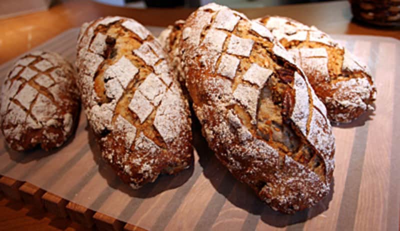 しっとりと、みずみずしいパンわたしが初めて口にしたシニフィアン・シニフィエのパンは、上の写真、チーズの皿のパンでした。焼き栗のグ ドゥ オートンヌ、ピーカンナッツと胡桃を両方使って味に奥行きを出したというパン オ ノア、「ドイツの知恵」という意味のドイチェ ヴァイスハイト、そしてバゲット。どれもがワインに合いそうなパンだと思いました。そしてしっとりとした生地にたたえられた水の量を想いました。パン オ ノアには「インカの目覚め」という北海道のジャガイモの裏ごしが入り、ドイチェ ヴァイスハイトにはレストブロート(パン粉)が入っていて、保水性を高めています。 レストブロートはロスをなくす(食べものを無駄にしない)ということだけではなく、このしっとりした感じや風味のよさにつながるのだそうです。