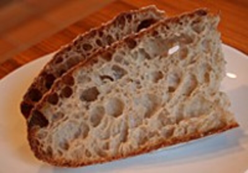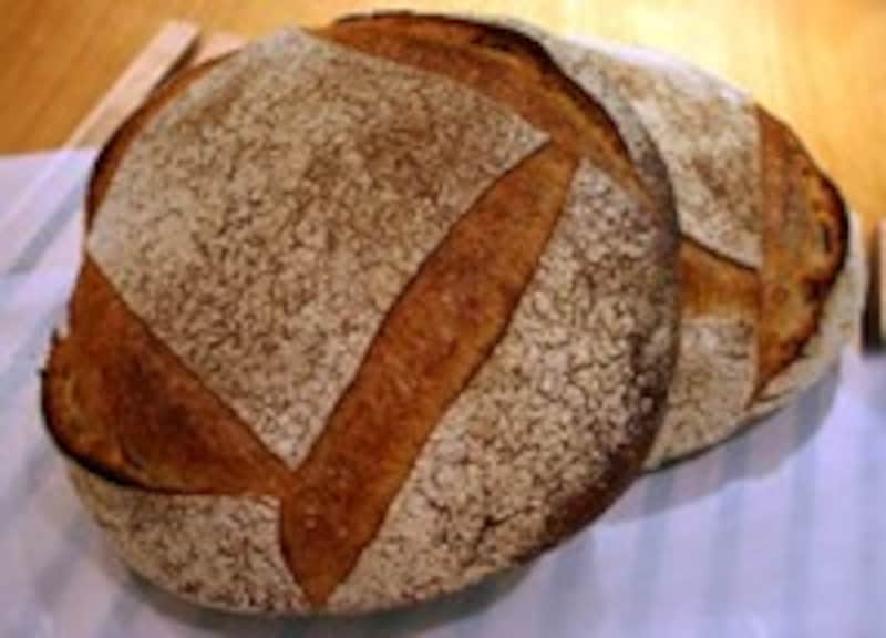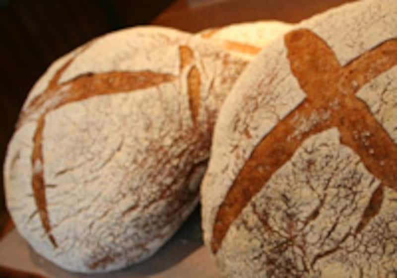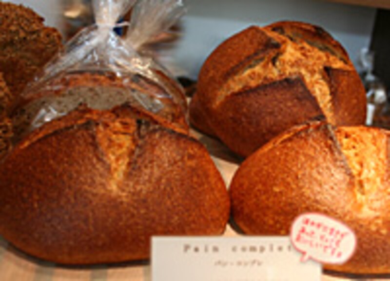 厳選された小麦粉を使った味わい深いパン小麦粉も自然なものを吟味しています。ポイントはパンになったときの味の濃さ。たとえばバゲットなどに配合しているフランスのビオ(オーガニック)粉はポワラーヌやプージョランなどの名店を顧客に連ねる、石臼だけの製粉ラインを持つ会社のもの。生命力が強く、酵素活性も強まるので職人にとって扱いづらい粉ですが、海洋深層水を使うなどして調整しています。 たとえば国産小麦は、北海道で「これなら強いパンがつくれる」と確信するものと出合い、可能性を探り始めたところだそう。 国産小麦のパンペイザンは、力強い味とやさしい甘味を感じられるパンです。