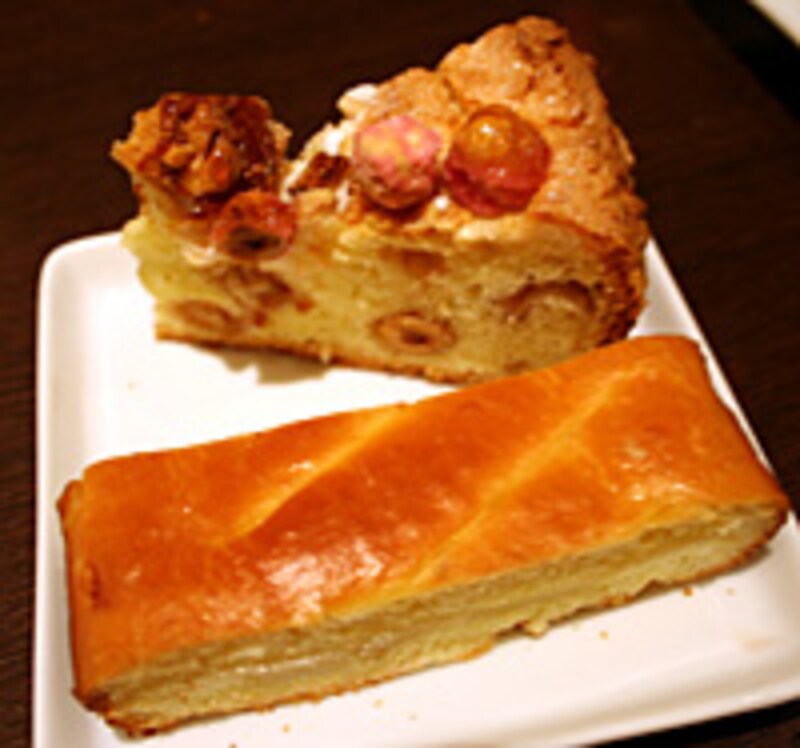 唯一この地方のスペシャリテとして紹介されたのがブリオッシュ・ド・サンジュニ。 サヴォア地方のブリオッシュはピンクのプラリネが特徴なのだそうです。このピンクはグロゼイユの色。トップのマカロン生地もサクサクとしてやさしい雰囲気の菓子パンでした。 ブリオッシュ・コンテはジャガイモとコンテのスライスをサンドしたブリオッシュ。リッチな味わい。 お土産のパンお土産のパンはパン・ド・ロデヴ(クルミレーズン)とセーグル・オ・ミエル(プレーン)。ロデヴは小さな町の名前です。成形しないとされるこのパンは素朴なかたちで、生地は水分を多く含み、しっとりもちもちとしていて、目が粗く気泡があるのが特徴です。味の濃い料理によく合います。 フランボワーズの蜂蜜入りのセーグル・オ・ミエルには、ライ麦が30%入っていますが、サワー種を使うドイツパンと違ってフランスのライ麦パンらしく軽い食感です。