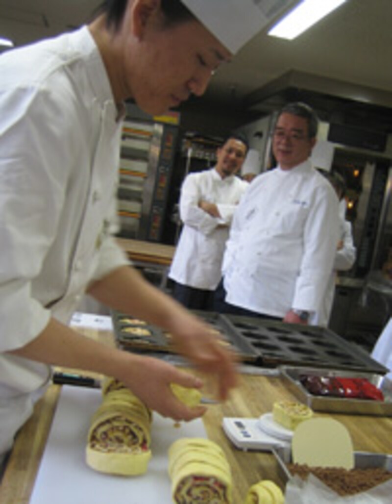 オーストラリア産マカダミアナッツを使った美味しいパンとお菓子のコンテスト概要オーストラリア・マカダミア協会主催「オーストラリア産マカダミアナッツを使った美味しいパンとお菓子のコンテスト」最終実技審査が2006 年11月25日、東京製菓学校において行われました。今年から製菓と製パン2部門になりました。この記事では製パン部門の結果を中心にお伝えします。製菓・製パンに携わるプロの技術者からの応募総数は201作品。うち製パン部門は113作品(98名)。第一次書類審査によって選ばれた8作品(8名)が実技審査に臨みました。 8時半に会場入り、14時まで実技審査、15時半までに試食と審議が行われました。 パンガイドの清水も審査員をつとめさせていただきました。 審査項目はアイディア度、外観・内層、香味の3ポイント。なかでも一番重要なのは香味、おいしさです。おいしさと一言で言っても、食感、舌触り、隠し味の「!」という感じ、 バランス、後味などさまざまな要素があります。 いかにマカダミアナッツをうまく活かしているかが大事だと昨年第一回のコンテストで学んだので今年はそのことにも意識を向けました。