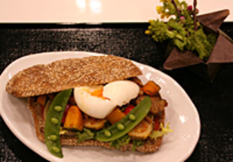 玄米粉入りのフランスパンに麺つゆ、レンコンや椎茸など和のテイストを加えたラタトゥイユ、半熟卵。 |