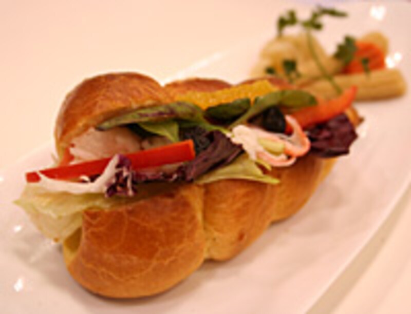 コロネ型のブリオッシュにさわやかなオレンジ、クリームチーズ、カニカマのサンドイッチ。食べやすいかたちに注目が集まっていました。 |