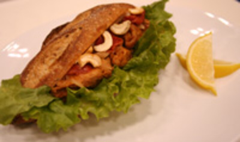 野菜とレンズ豆のカレーの春巻きをさらにジャガイモの衣で揚げ、ピクルスサワークリームと共にバゲットにサンド。ボリュームたっぷり。 |
