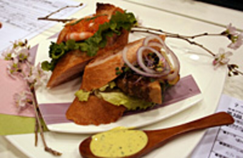 桜を練りこんだバゲットに「角煮とネギ、ふきのとう」、「えびと菜の花、木の芽マヨネーズ」の2種のサンド。 |