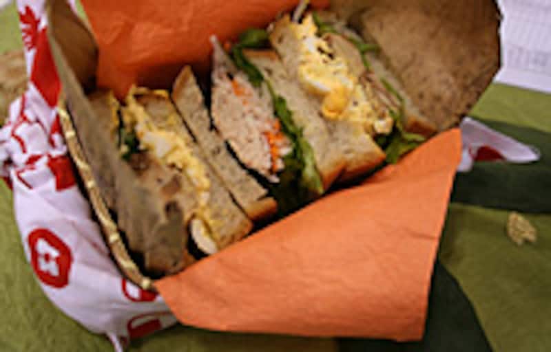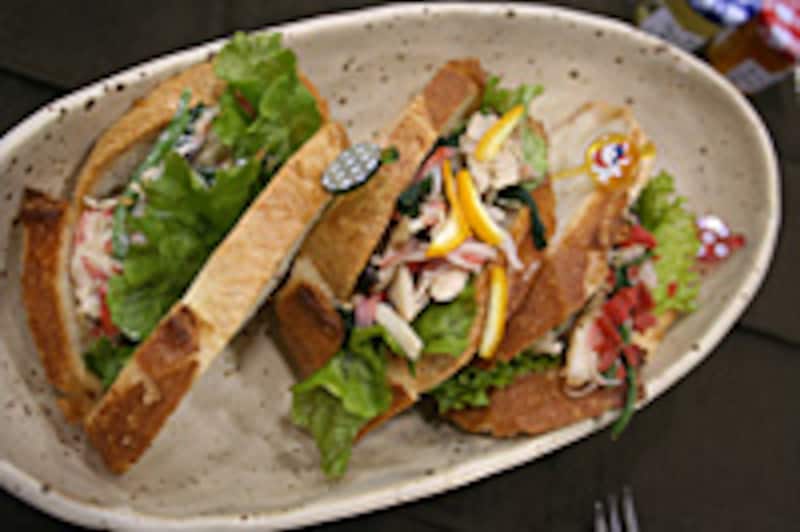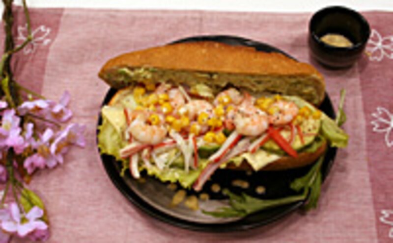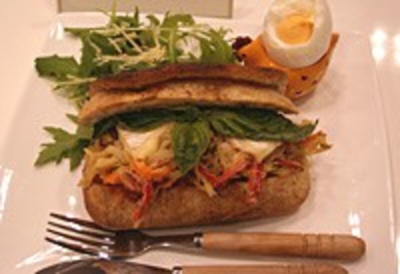![]() | 堀越佳子さん(埼玉県) ■かき揚げ天ぷらのタバチェ 胚芽入りフランスパンに生ハム、パプリカ、タマネギ、ローズマリーのかき揚げ、カマンベールチーズ、バジルのサンド |