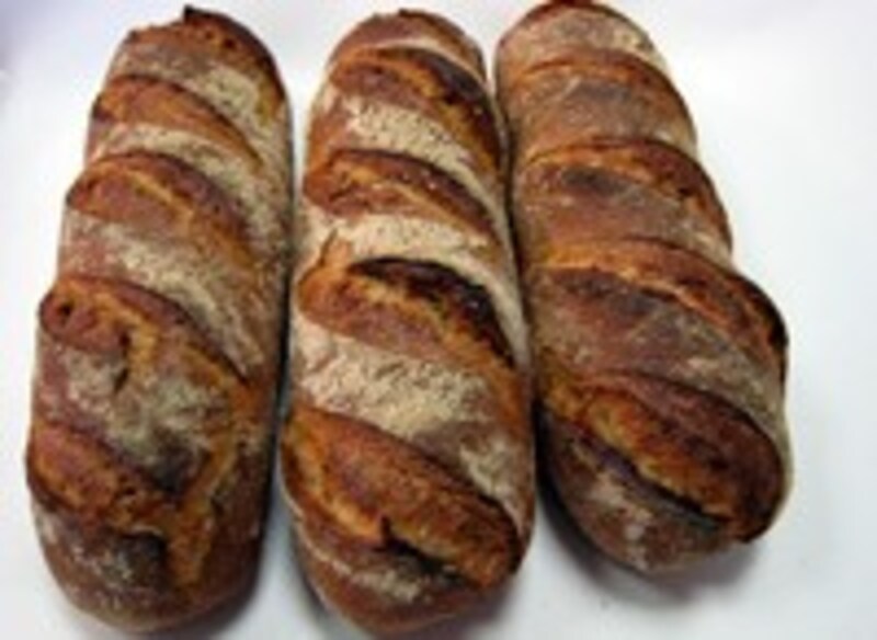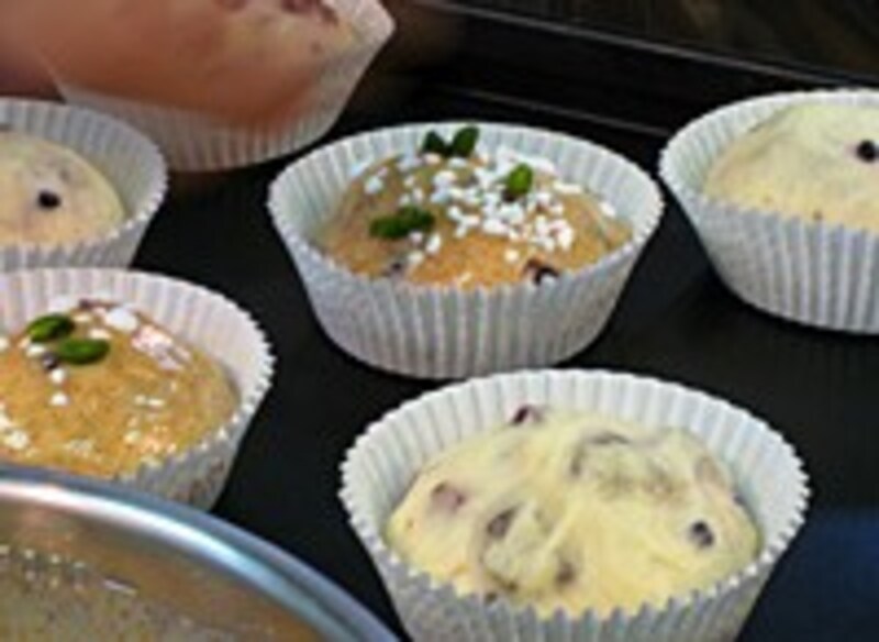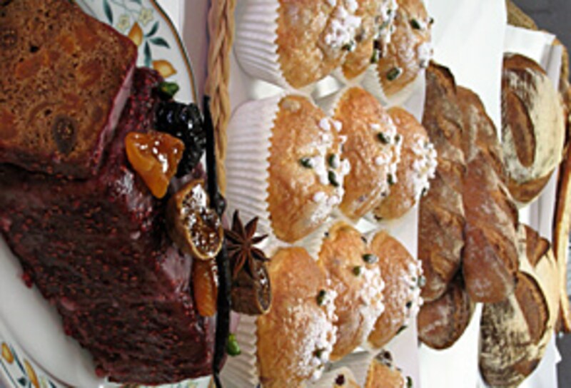 実演されたパンはフランス産石臼挽き小麦のバゲットポーリッシュ(左上)、パンドカンパーニュ(右上)、蜂蜜がたっぷり20%入ったパンオミエル・フリュイルージュ(左下)、ドイツ産の石臼挽きライ麦粉40%のパンオセーグル(右下)。 そのほかに国産小麦のバゲットリュスティック、パンドエピス(シナモン、ナツメッグ、カルダモン、アニス、クローブなどスパイス入りの蜂蜜ケーキ)、ケークオフリュイ(フルーツケーキ。スパイスが苦手の人のために)の試食がありました。 パンオミエル・フリュイルージュの生地にはドライのベリーが3種類入っています。卵白と上白糖、ヴァニラシュガー、アーモンドプードル、粉砂糖を合わせて絞り、あられ糖、ピスタチオ、粉糖で仕上げています。ふんわりスイートな蜂蜜パンでした。