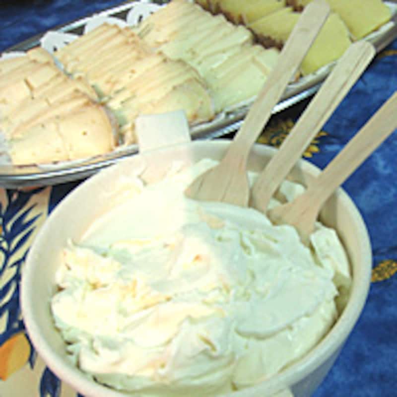 | 左の写真:ナッツのような風味もあるルブロション・フェルミエAOC(左奥)、製造量輸出量フランス第1位の コンテエクストラAOC(右奥)、イタリアのフレッシュタイプ、マスカルポーネ(手前) 右の写真:チーズケーキのようなクリーミーな濃厚さのフレッシュタイプ、ブリア・サヴァラン |