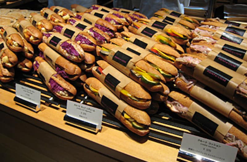 メイドイン東京のパン「メイドインTOKYOのパンを世界へ発信していく」というコンセプトのもと、東京にまたひとつ新しいパン屋さんがOPENしました。場所は新丸ビルの地下。青山のデュヌラルテ、吉祥寺のダンディゾンに続き、淺野正己さんがプロデュースしたPOINT ET LIGNE(ポワンエリーニュ)です。 日本語で「点と線」を意味するその名には、「 フランスパン、ドイツパンなど世界中からパンを受け入れてきた日本から、今度はワールドワイドに通用する新しいパンを発信していきたい。東京という都市(点)から世界(線)へとつなげたい」。そんな想いが込められています。 淺野さんのお店の名前はいつもそんなふうに個性的でロマンチック。 さて、ポワンエリーニュにはどんなパンがあるのでしょうか。