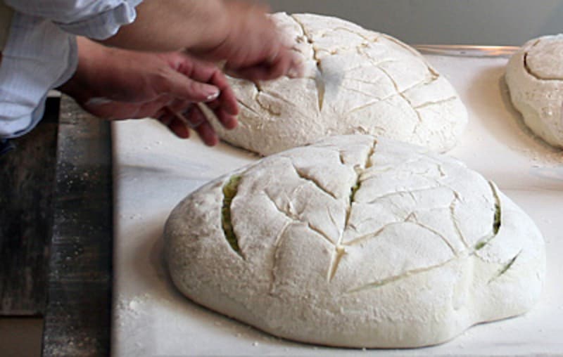 | 木の葉のかたちのクープをいれているところ。切り口にうっすらと抹茶の緑がのぞく。 |