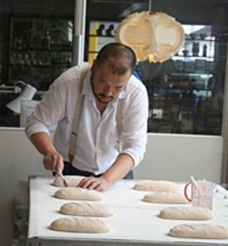| 酵母を採取する後楽園周辺の緑地。生命力に溢れる緑、湿った土、枯れた葉の香り、酵母の気配。 | 工房の秀島さん。カンパーニュにクープを入れる、パンの仕上げのひと仕事。 |