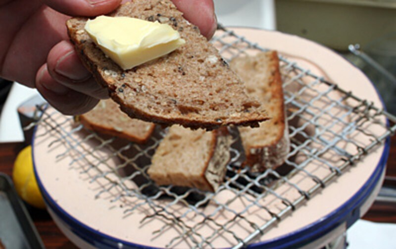 | 七輪でドイツパン。つめたいバターを削ってのせて。 |