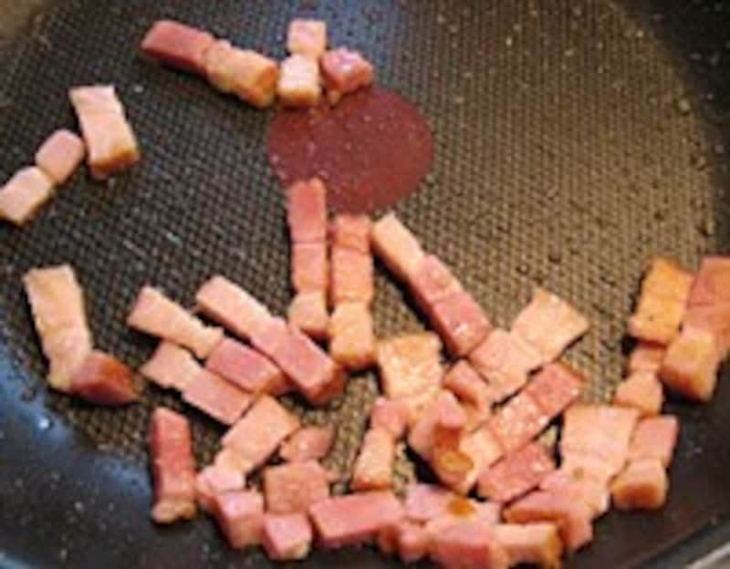 6: ベーコンは厚めに、細かく切ってフライパンでよく炒める。油がたくさん出てくるようならふき取る。