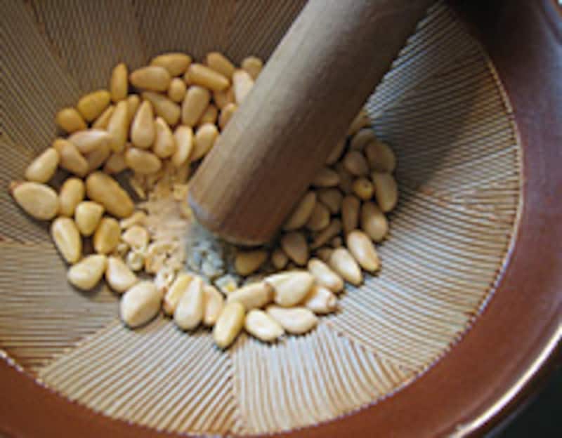 2: 松の実をすり鉢でペースト状になるまですりつぶす。少し粒が残ってもいい。