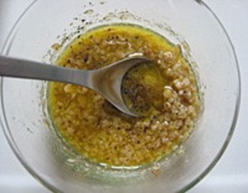4:小鉢に2と、3のうちの小さじ1杯を入れて、オリーブオイル、ワインヴィネガー、塩、胡椒を加え混ぜてドレッシングをつくる。