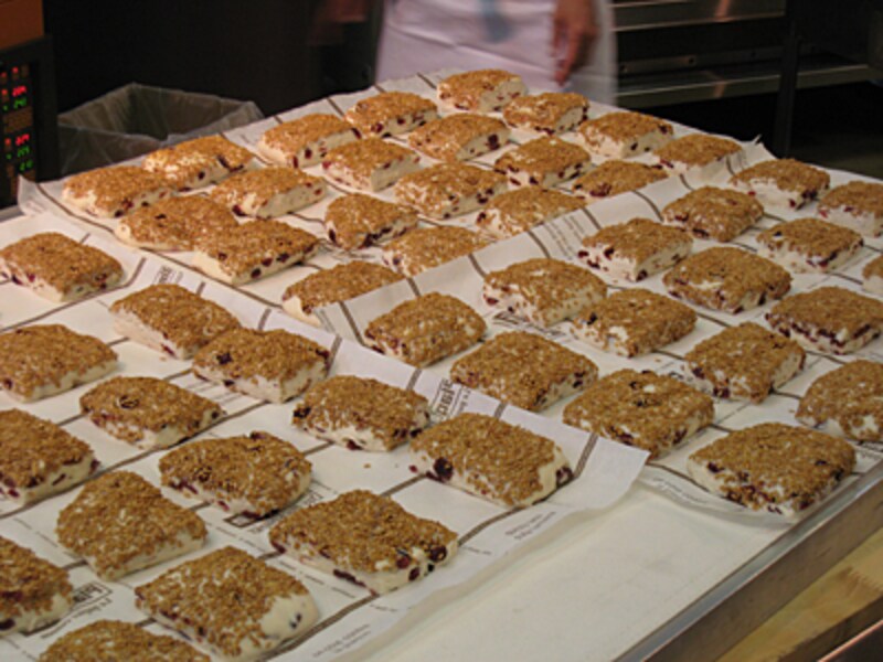 | クランベリーのカントリーブレッド。 ソフトフランスの生地で焼く切りっぱなしのパン。トッピングはローストアマニ。 |