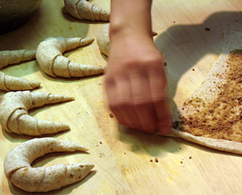| クレッセントの成形。これは溶かしバターと黒糖を巻き上げているところ。 |