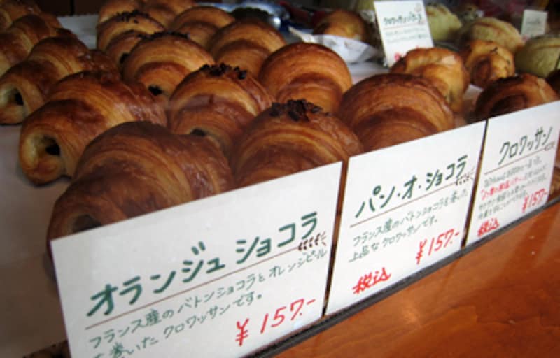 | クロワッサンのバリエーションはパン・オ・ショコラ、フランボワーズ入りのクロワッサンダマンドの他、オランジュ、マロン、バナーヌなど数種類。(157円~241円) |