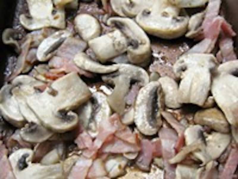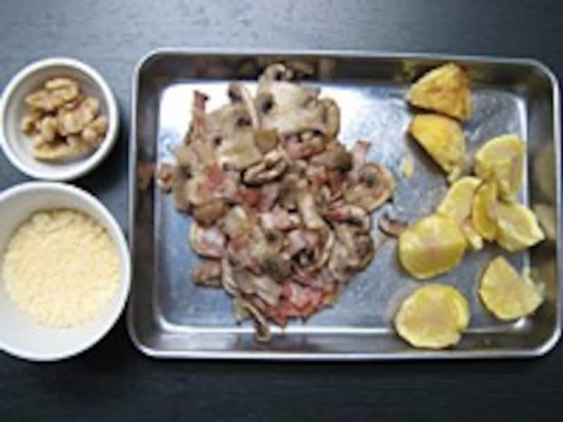 4:食べる直前にパンに栗とキノコ炒め、エダムチーズ、クルミをのせてトースターで香ばしく焦げ目をつける。