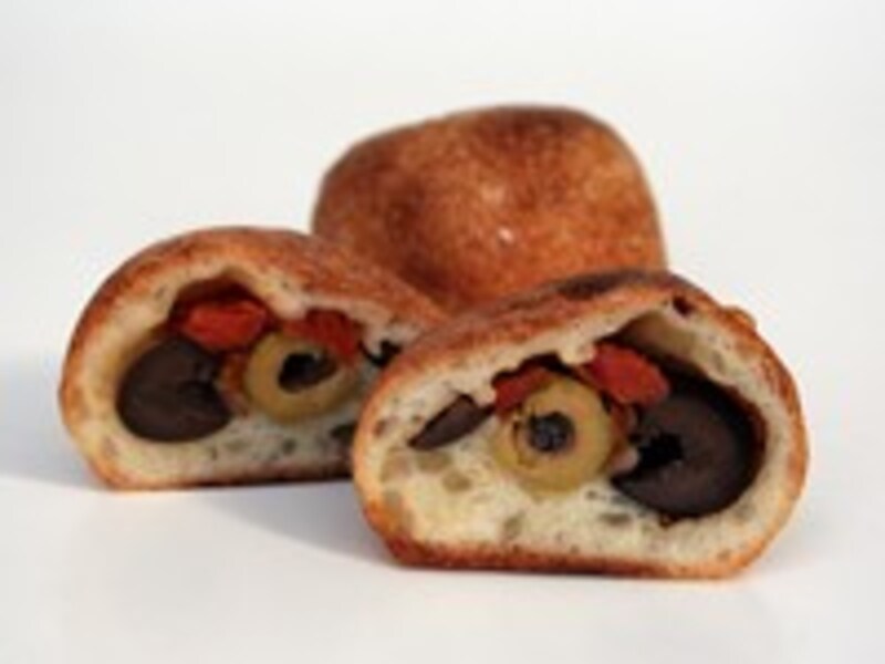 自家製スペシャルマリネ(黒オリーブ、緑オリーブ、ニンニク漬けセミドライトマト)を軽い食感のレジェール生地で包み込んだ小さなパン。