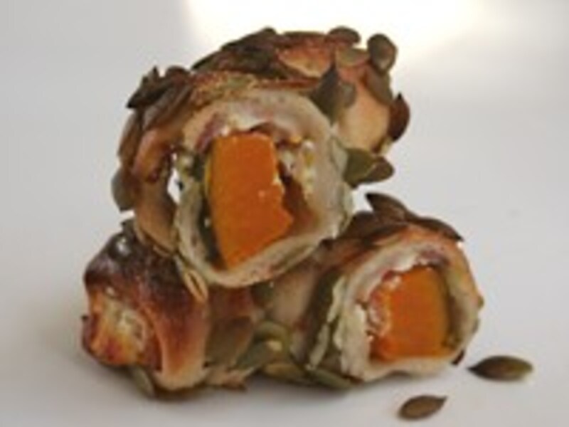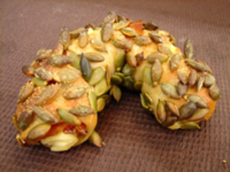 自家製ブドウ種を使用したカンパーニュ生地で 蒸したカボチャ、クリームチーズ、ベーコンを巻き込んだパン。