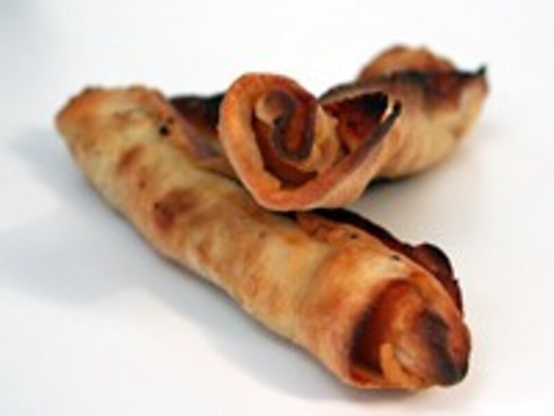 フランス産小麦を使ったマリアージュ ドゥ ファリーヌの看板生地にエダムチーズ、生ハム、黒コショウを包み、シガーのようにクルクル 巻いて焼き上げてあります。