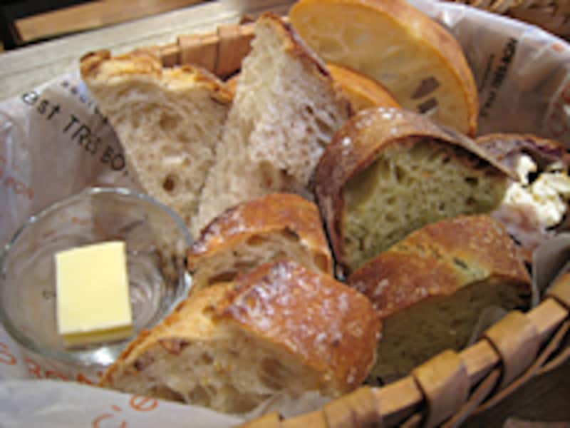 この日ガイドが選んだ「スープとパンとサラダのセット」には数種類のパンの盛り合わせがついていて、さまざまな味を楽しむことができました。グリンピースと枝豆の練りこまれた薄緑色のソフトなパン、オリーブオイルの香るみずみずしい生地のシャバタ、ハード系ではセレアルバゲット、クリームチーズ入りのベリーベリー、ほのかな酸味を感じるパンオルヴァンなどです。ルヴァンは日々研究していて、オープンのときグレープフルーツから起こした種を継ぎ続けているのだそうです。