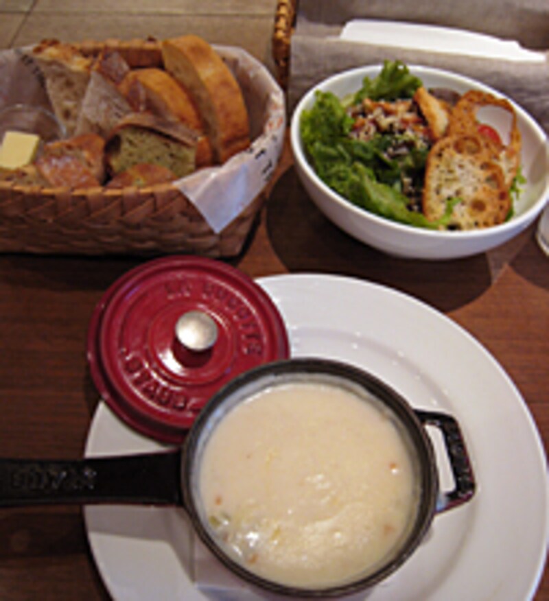 スープは日替わりで、小さいながらたっぷりと入るSTAUBの鍋でサーヴされます。この日は熱々でクリーミーなクラムチャウダーでした。オイルとヴィネガーのシンプルなドレッシングで味わう葉野菜のサラダは、ハーブの香るクルトンやワイルドライス、ナッツのトッピングが香ばしく、ただの付け合せにあらず。