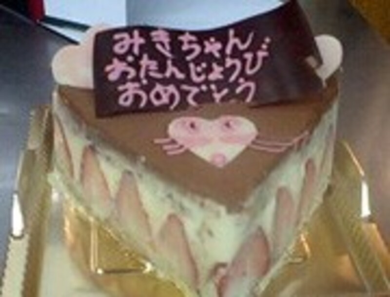 | そのオーダーメイドケーキ。チョコのプレートの後ろはイチゴとハート。 |