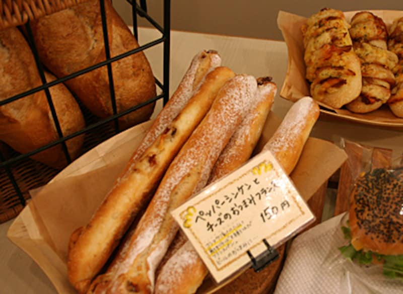 お昼頃、チーズやハム、オリーブなどを使ったパンが次々に焼きあがります。フォカッチャやナン風のパン、エダムチーズをまぶしただけのシンプルな味わいのチーズボールなど、柔らかいのに適度な弾力のある生地は、マッシュポテトを練りこんでいるそうです。ドライトマトの酸味、胡椒のきいたハムや自家製カレーのスパイシーさはこれからの暑い季節によさそうです。![]()  |