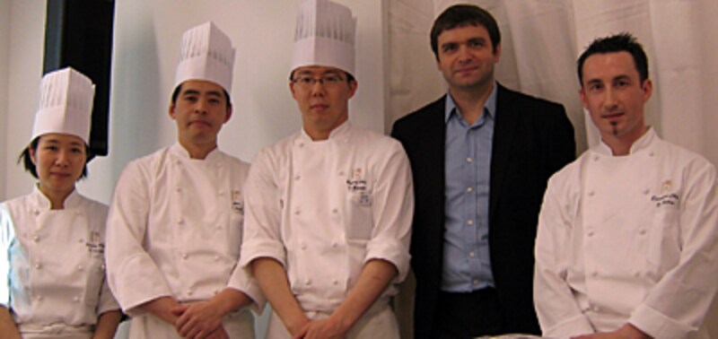 | 左からデザート担当の近藤智子さん、惣菜担当の上田達生さん、パン担当の本間智哉さん、グループ・アラン・デュカスのコーポレートシェフパティシエのニコラ・ベルジュさん、エグゼクティブシェフのダヴィッド・ブランさん。 |