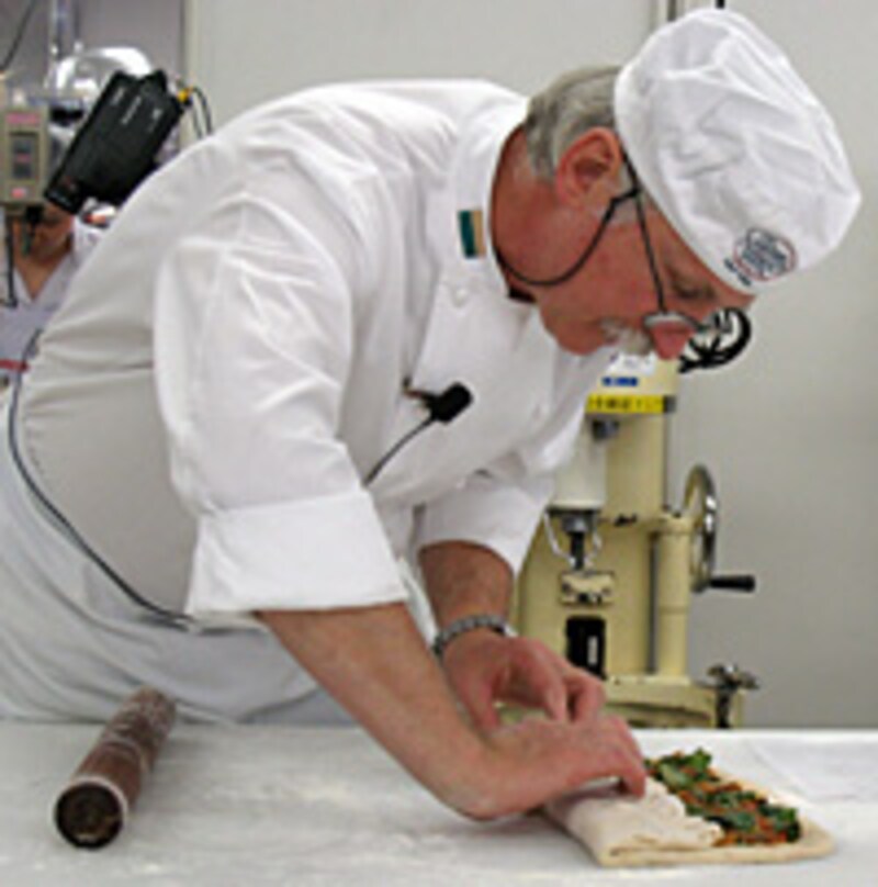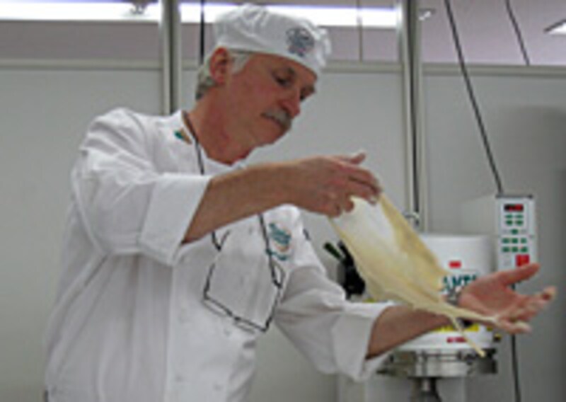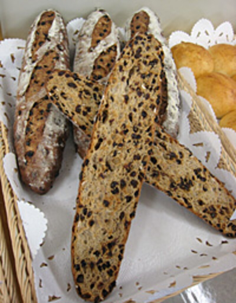 実演されなかった2種類のパンは、全粒粉が40%、レーズン25%のリュスティックと全粒粉30%、ライフレーク8%、カレンズ58%のライ麦パン。どちらも濃い目のブラウンで素朴な表情です。数年前は日本のレストランで出てくるパンは白一色だったのに最近はダークな色合いのパンを出すところも多くなったようで、昨晩など半分以上は濃い色のパンだったから驚いた、とジョリンさん。料理に合わせていろいろなパンが食べられたら素敵ですね。これらは、チーズに合わせたいパンです。