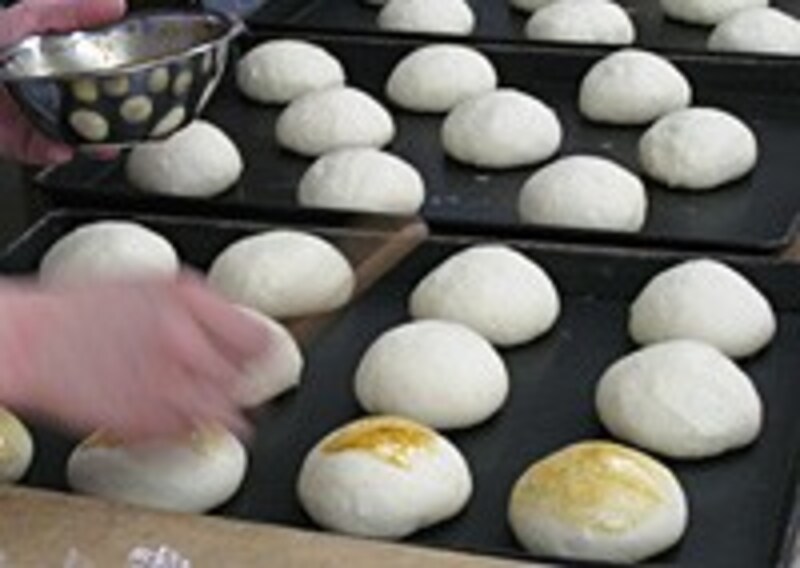 コツはよくミキシングすること。生地がよく伸びれば焼成中に破れないのです。焼く前に味噌と卵を混ぜたものを塗って風味と艶を出します。