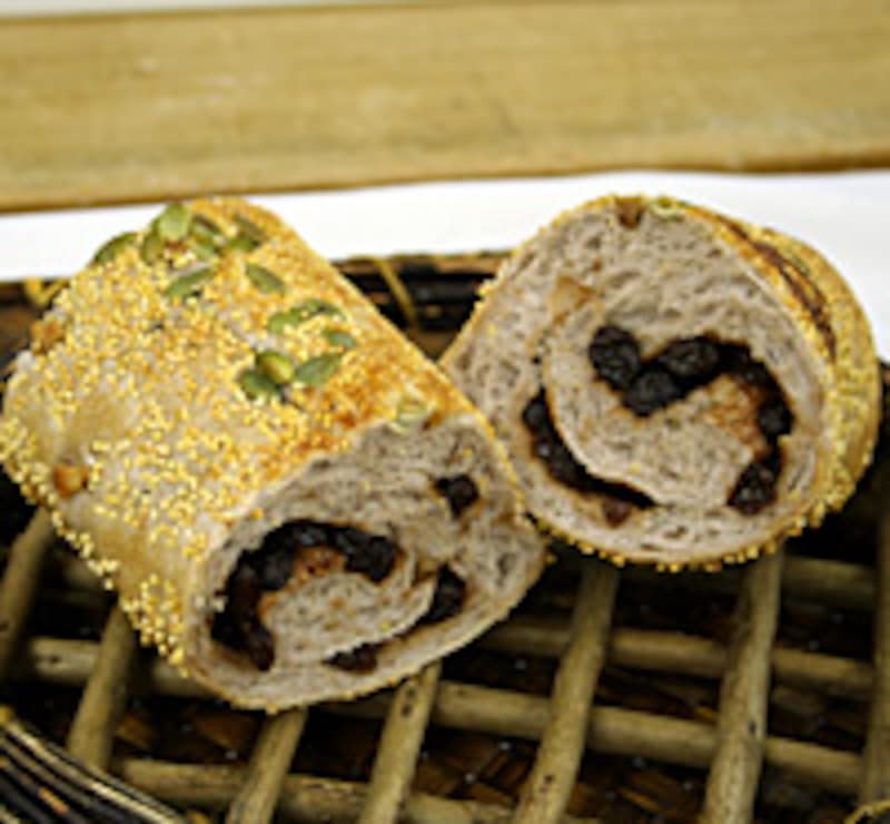 「アロマティックレザン」は大西さんの好きなヴァンショー(ホットワイン)のようにシナモン、アニス、オレンジの香りを移した赤ワインで作ったレーズンパン。香りが心を、ポリフェノールや穀物(もちきび、パンプキンシード)が体を癒すという魅力的なパンです。![]() ![]() |