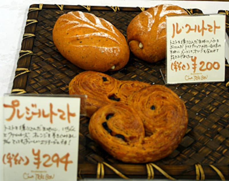 トマトペーストとバジルが入った生地で作る2種類のパンのうち「プレジール トマト」はクリームチーズ、オレンジ、イチジク入り。意外なようで相性抜群の組合せです。「ル・クールトマト」は15%のバターが折り込まれた生地にオリーブとベーコンを巻き込んでいます。