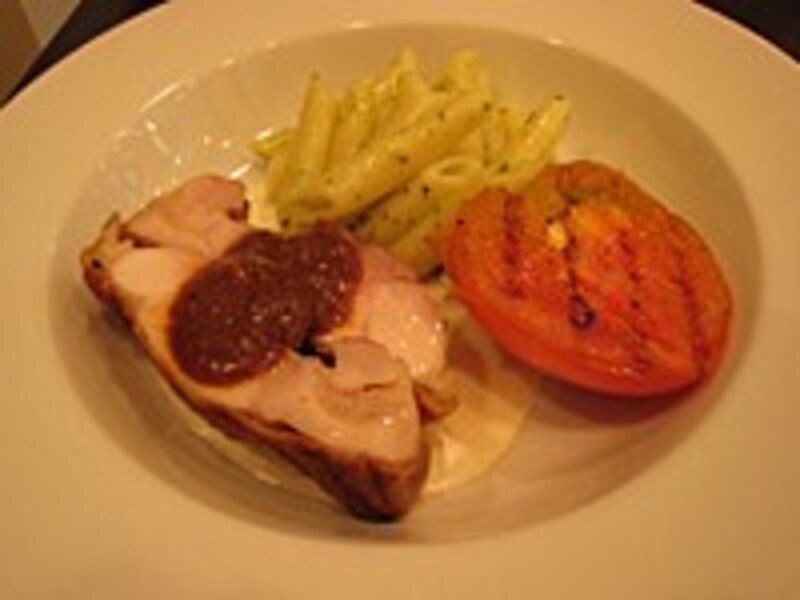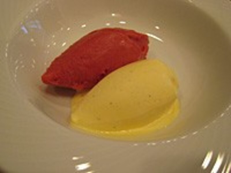 | 若鶏モモ肉のポアレ ペンネブールとトマト | デザート(ヴァニラアイスクリームとイチゴのソルベ) |