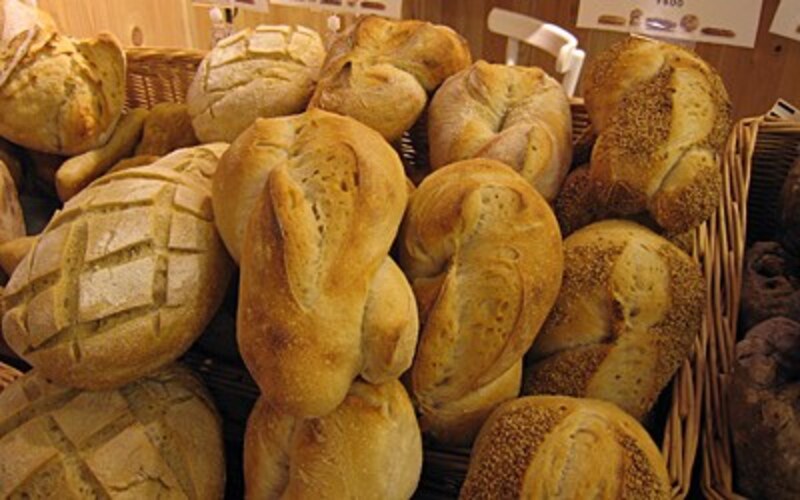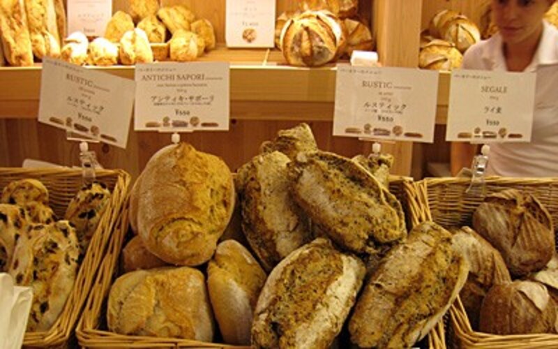 | 左から、ルスティック(レーズン)、アンティキサポーリ(スペルト小麦などを使用した伝統的なピエモンテのパン)、ルスティック(シード類)、ライ麦パン |
