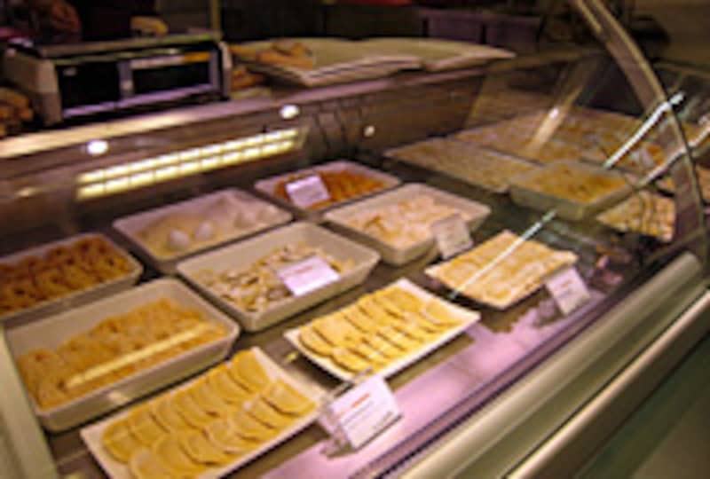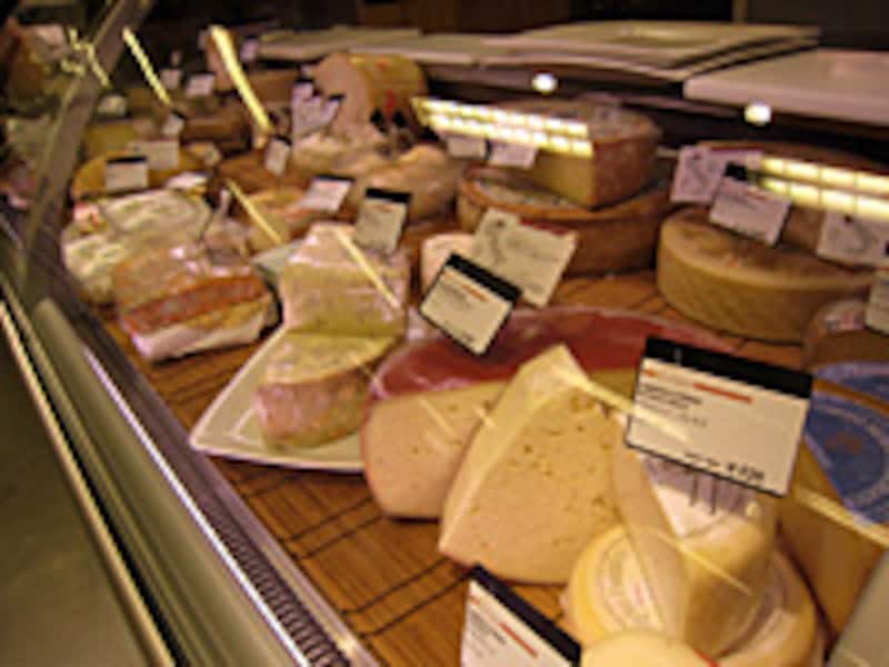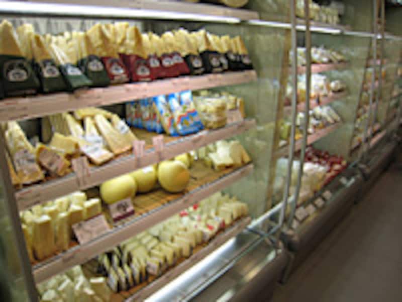 イタリア各地の生ハム、ピエモンテ産のサラミなどの肉加工品は40種類以上、イタリア産やフランス産を中心とした良質なチーズは、約100種類あるそうです。チーズは対面販売のショウケースに入ったクリーミーなタイプの他、「簡単に食べられる製品」コーナーには硬質系のチーズが並びます。パルミジャーノ・レッジャーノだけでも熟成期間十数ヶ月から何十ヶ月に及ぶものまで何種類も並んでいて、これはかなり楽しく迷ってしまいます。カチョカバッロ、グラナ・パダーノなども豊富な品揃えです。