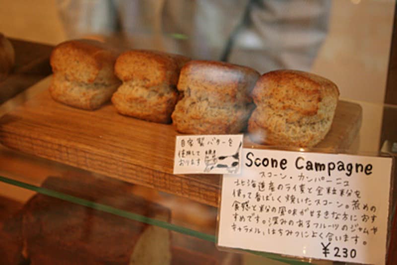 | スコーンは国産小麦のスコーン・メゾン、フランス小麦のスコーン・フランセーズ、紅茶のティースコーン、そして北海道産のライ麦と全粒粉をいれたスコーン・カンパーニュなど数種類で、使用バターもそれぞれ。 |