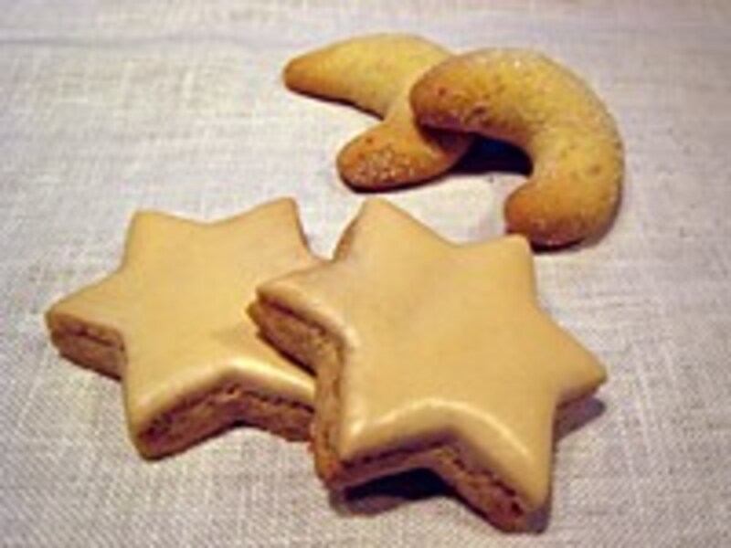 バニラビーンズを使用したサクサクのバニラクッキーと、小麦粉を使わずアーモンドプードルだけで作るシナモンの星型クッキーは、ドイツの伝統的なクリスマス菓子ですが、ブロート屋にはいつもあります。星型のほうはハードな食感。さくらんぼのお酒とシナモンがほのかに香ります。|  |  |