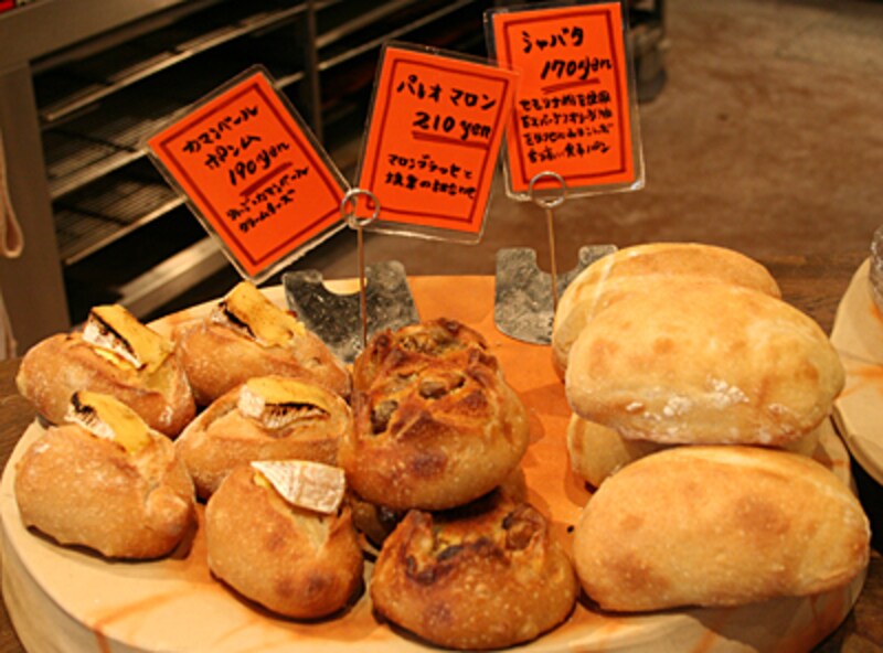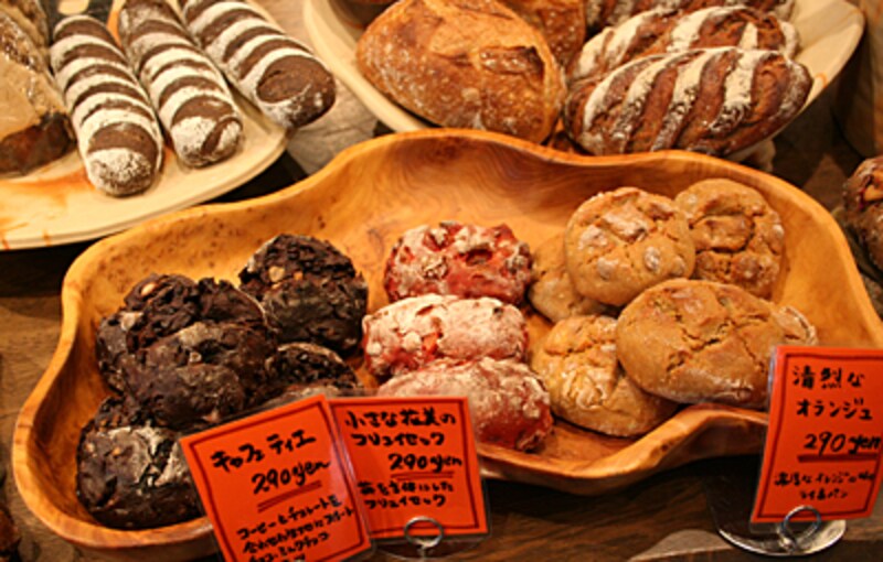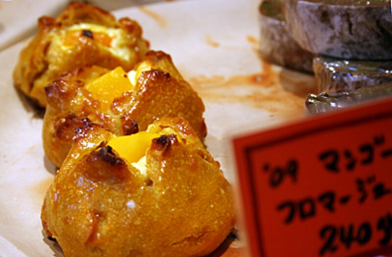思わず見入ってしまうのはパンの名前。 「清冽なオランジュ」、「森をさまようミエル」、「'09マンゴーフロマージュ」など、どこか作品ぽい名前がついています。「 もともと芸大で油絵をやっていて、画家を目指していたんです。でも27歳の頃挫折したんですね。ケーキが好きで、イル・プルー・シュル・ラ・セーヌの弓田さんとの出会いがありました。”ゴッホのようなバナナ”というケーキがあるんですけど、弓田さんは”ゴッホの黄色しか思い浮かばない”とおっしゃって、その意味が僕にはよくわかったんです。そうなんだ、お菓子を作るのも絵を描くのも同じプロセスなのかもしれない。やってみよう、と思ったんです」