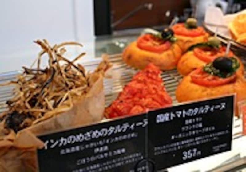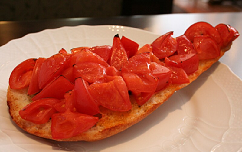 | 国産トマトのタルティーヌ(357円) バタール生地をチャバタ風に焼いて、アンチョビを塗った上にトマトのざく切り。それを軽く焼いている。フレッシュなのにソースみたいに濃厚な味わい。 |