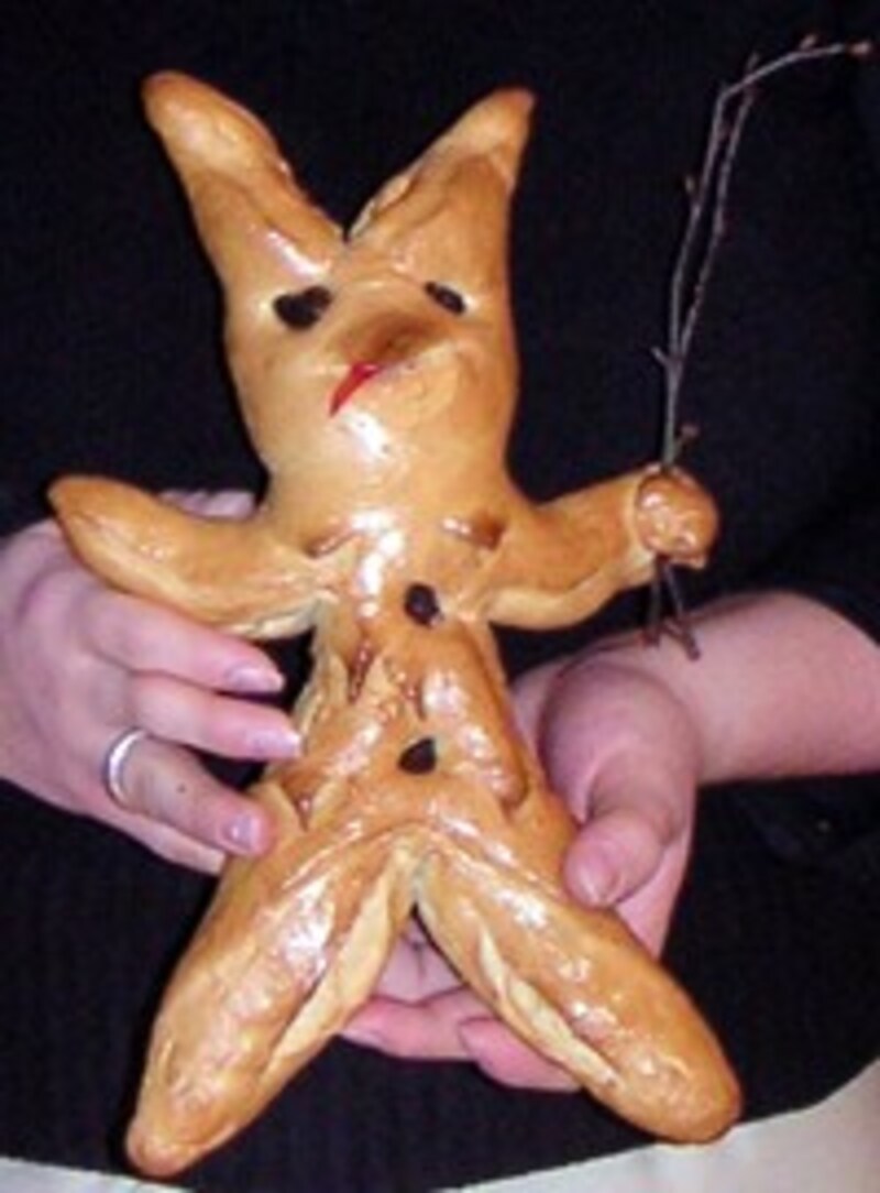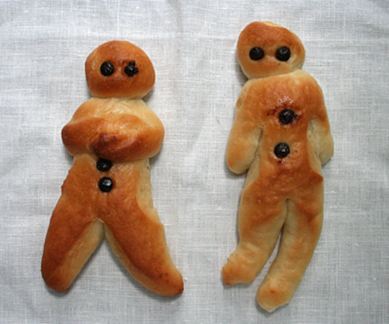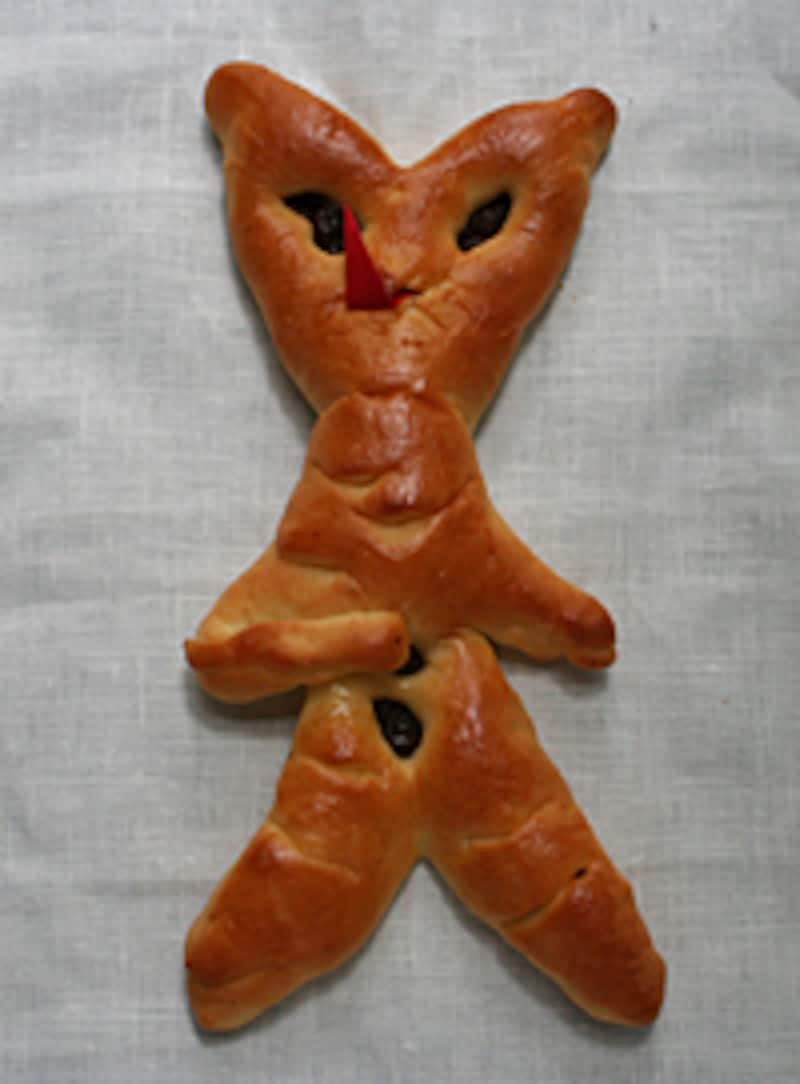 パンにはいろいろなかたちがあります。丸いブール、棒状のバゲット、箱型の食パン……。 日常のパンはシンプルです。一方で、非日常のパンは何かをかたどった象形(しょうけい)パンが多いそうです。生地も卵や牛乳やフルーツなどを加えた結構リッチな配合です。ヒトのかたちのパンは非日常のパンです。ヨーロッパでは12月初旬の聖ニコラウス祭、の頃に町のパン屋さんのウィンドウに並びます。小麦粉に水分を入れてこねるパンはかたちづくりやすいので、古くから祭事のシンボルとなってきたのですね。