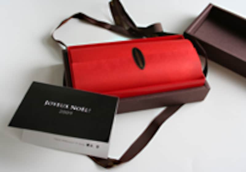 | シックなブラウンの箱の中は赤い包み紙。カードにはシェフ・ブーランジェの榎本哲さんからのメッセージ。 |