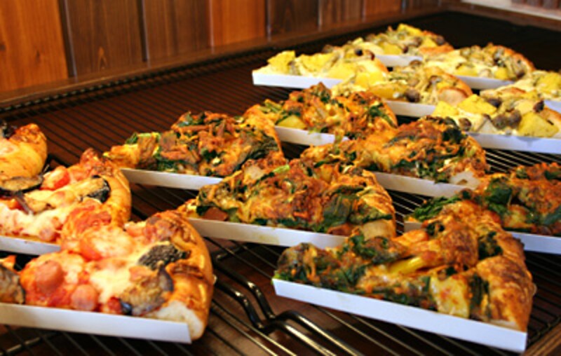 | ピザ各種、揚げナスとソーセージ(320円)、本日のカレーピザ(400円)、インカの目覚めとキノコ(350円) |